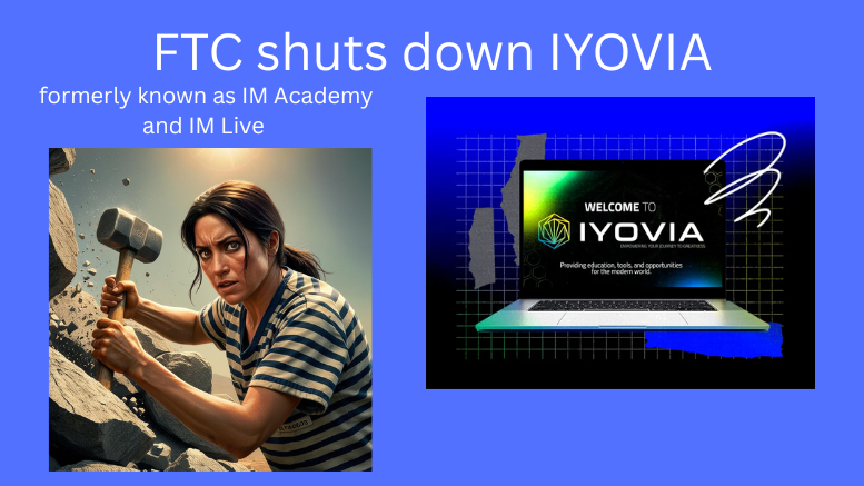 IM Academy or IM Live or variations of the name have been in the news for years. A name change to Iyovia didn’t keep it away from the Federal Trade Commission FTC or the Nevada Attorneys. The players involved include Christopher Terry, Alex Morton, Matthew Rosa, Jason Brown, Brandon Boyd.